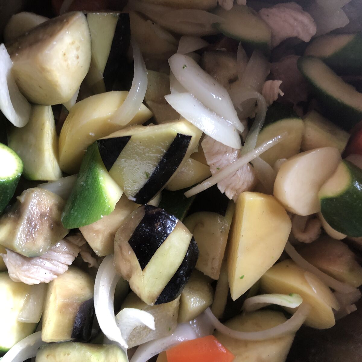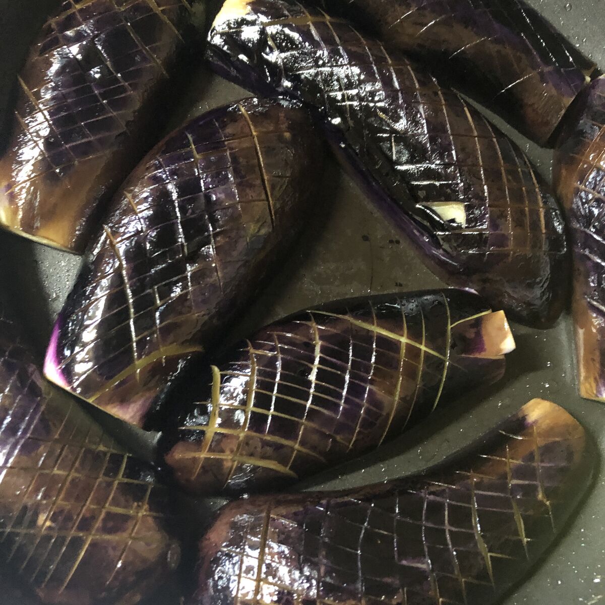 ナスはフライパンで2回に分けて焼きますが、形がそれぞれ違うので、パズルのようになるべくたくさん焼けるように試行錯誤します。