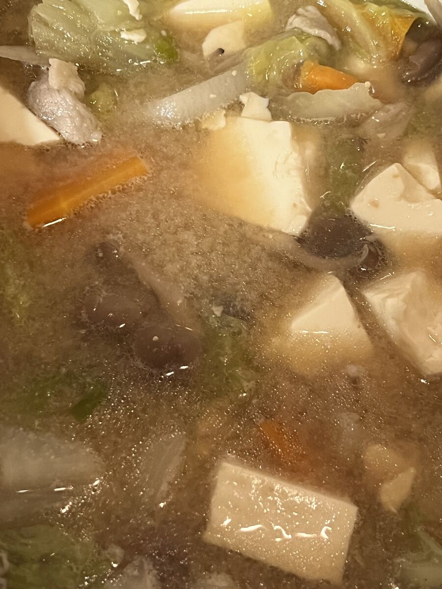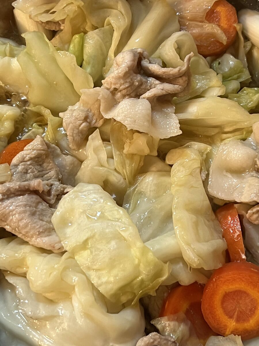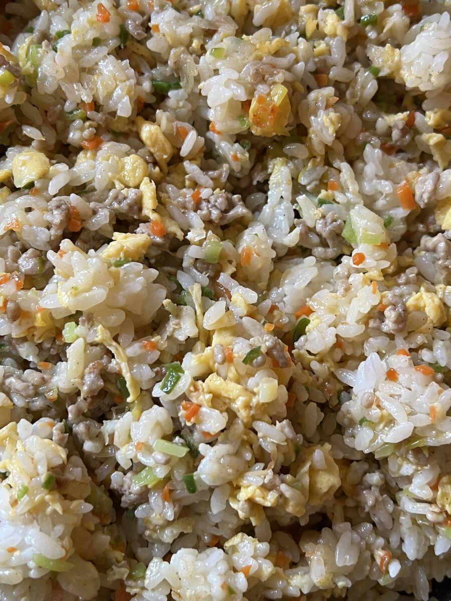 残りごはんでひき肉のチャーハン、野菜スープ、キャベツのサラダでした。