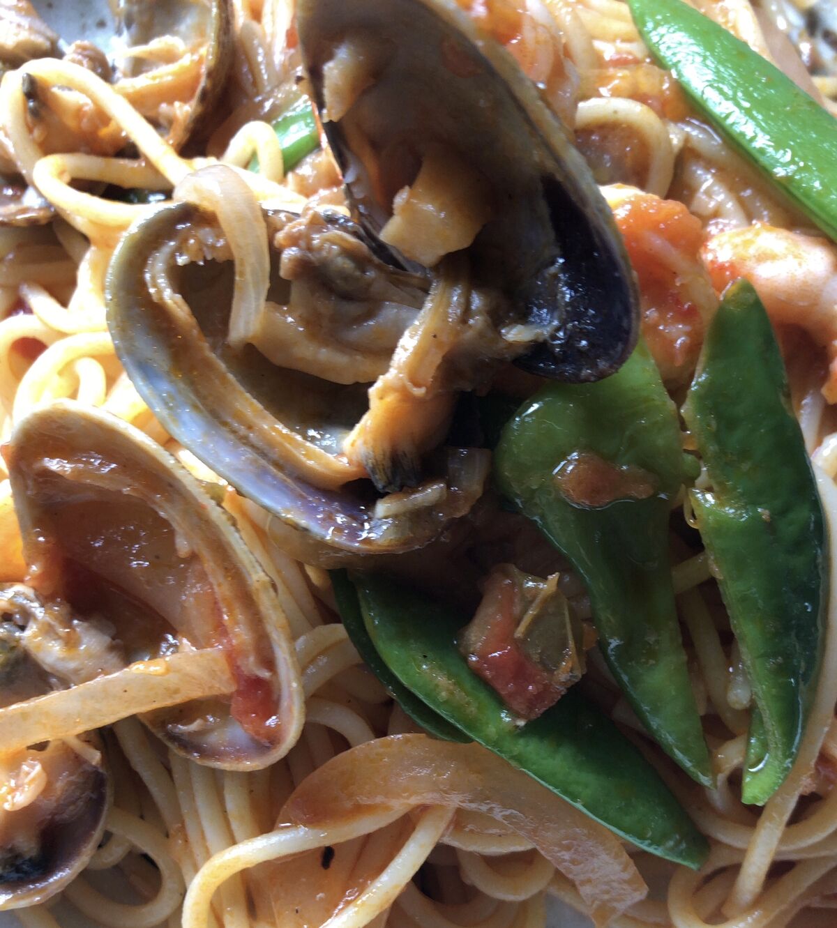 スパゲッティに入れた方が、同じ数のアサリでも豪華に見えます。