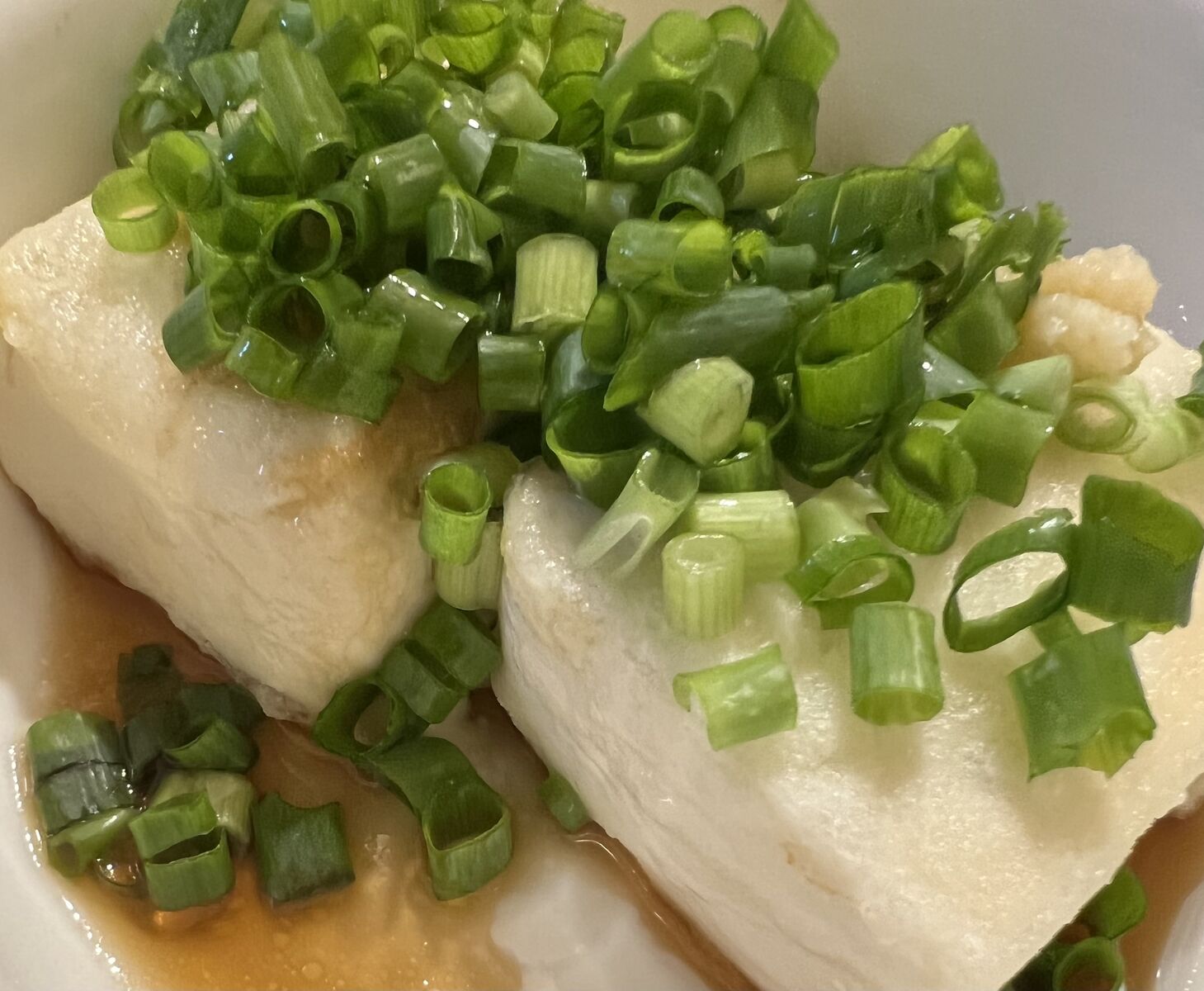 片栗粉をつけて焼いた豆腐の、青ネギのせ。