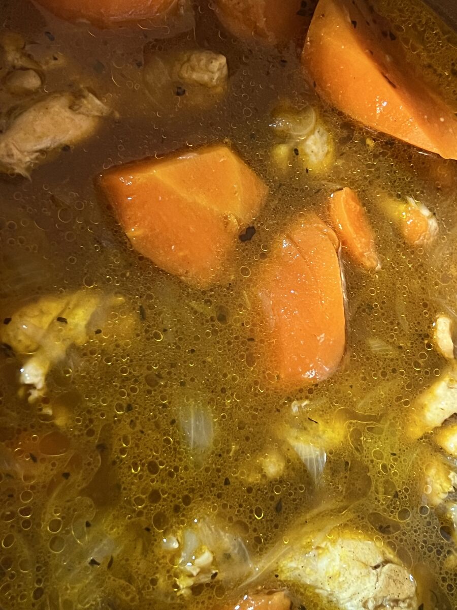 カレー粉と塩胡椒で具材を炒めて、お水とコンソメスープを投入して煮込むカレースープ、仕上げにほんの少しだけカレールーを使います。