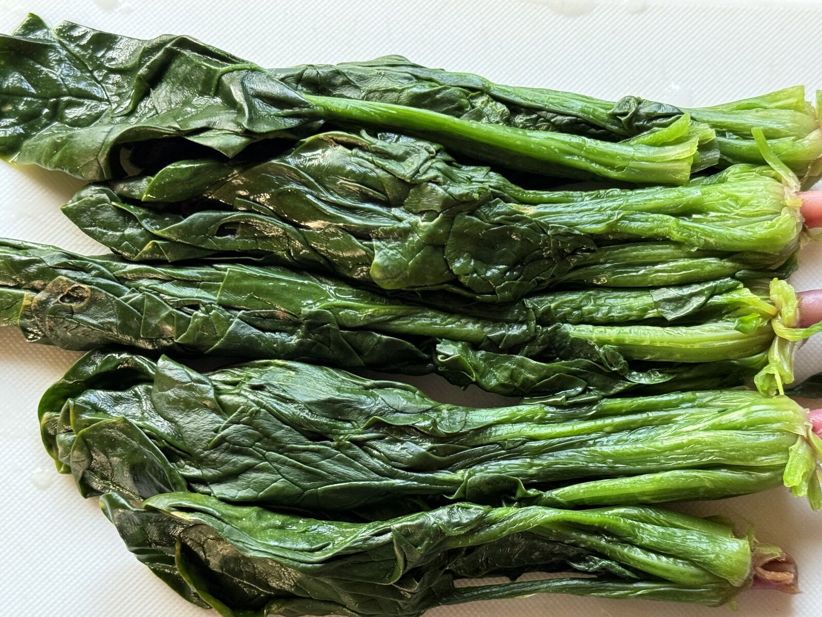 「好きな風に料理してね」と言ってくれましたが、このきれいな仕事を見ると、そのままおひたしにする事にしました。