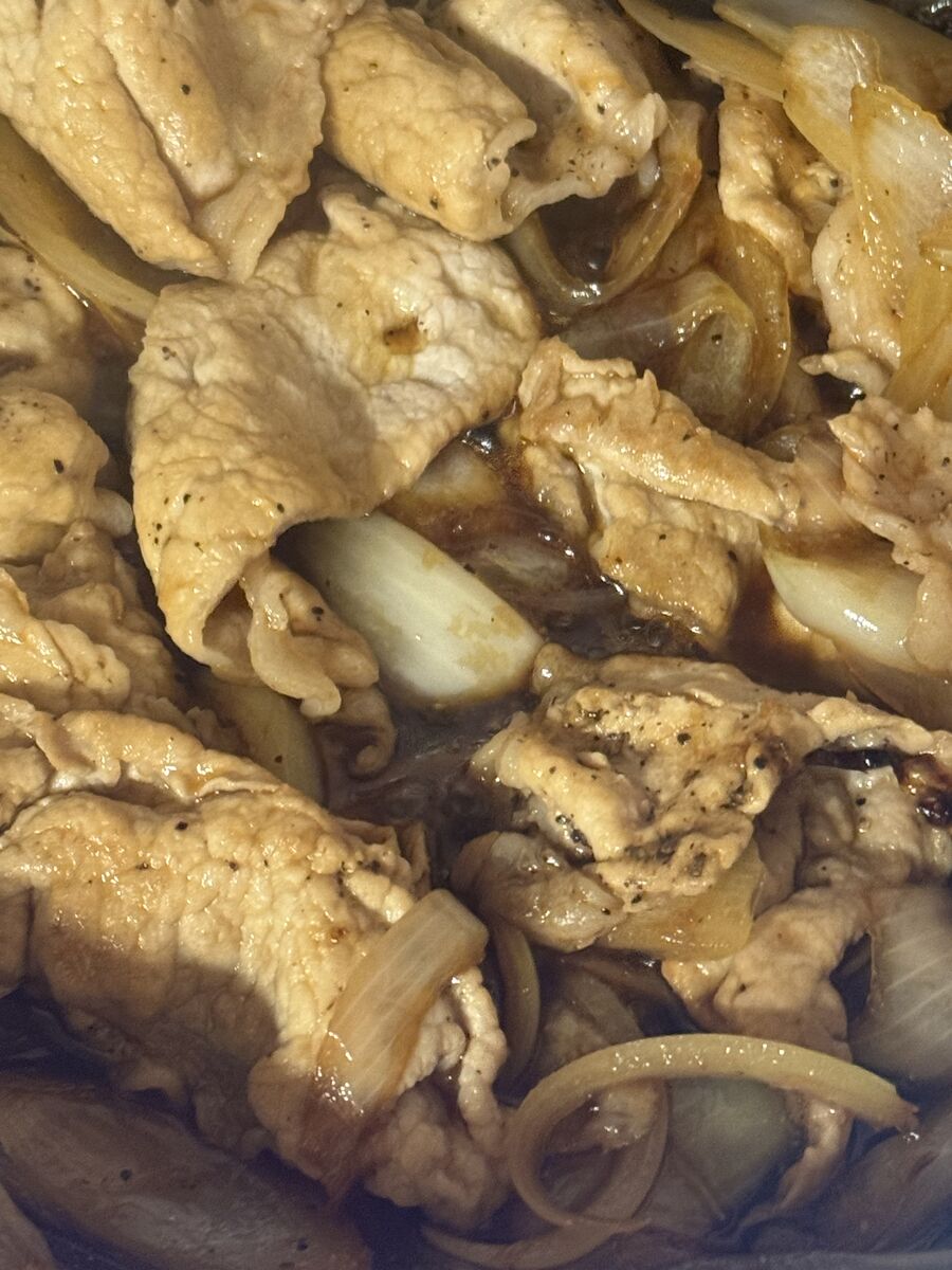豚肉の甘辛焼き、塩胡麻キャベツ、豆腐のサラダ、漬物、お味噌汁でした。