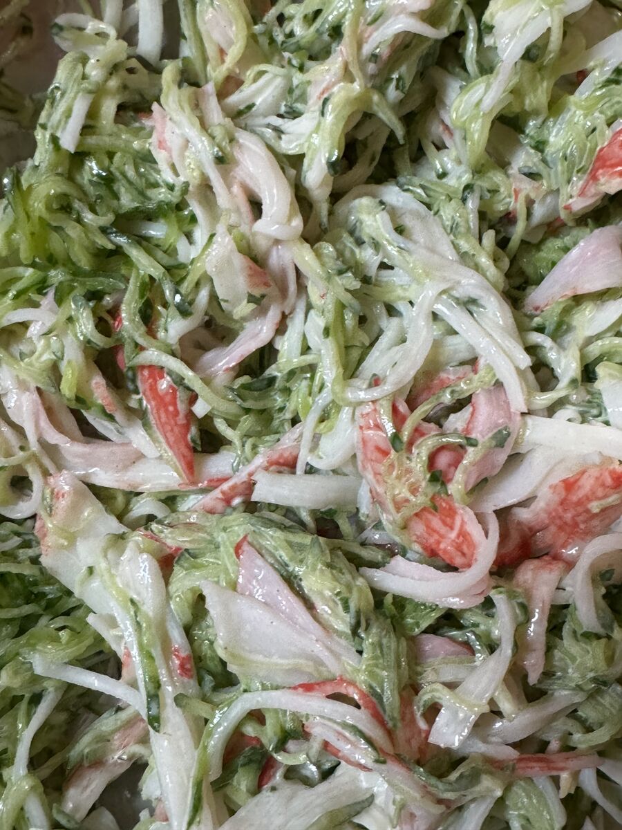 きゅうりとカニカマサラダ、漬物、お味噌汁でした。