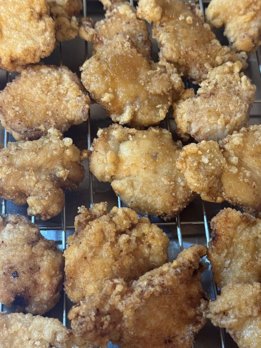 夫と義父のリクエストの唐揚げと、冷凍しておいた茹でほうれん草の胡麻和え、白菜とエビのあんかけ、漬物、お味噌汁でした。